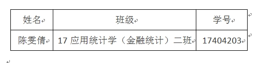 根据《爱游戏 (aiyouxi)官方网站学生国内访学管理暂行办法》和《关于做好2018年选拔优秀学生进入校本部交流学习的通知》等文件精神,结合《爱游戏 (aiyouxi)官方网站“赴上海财经大学访问学生”项目选拔的通知》,经个人申报、系部资格审查,统计系拟推荐陈雯倩同学获得“2018年赴上海财经大学访问学生”资格。现予以公示。